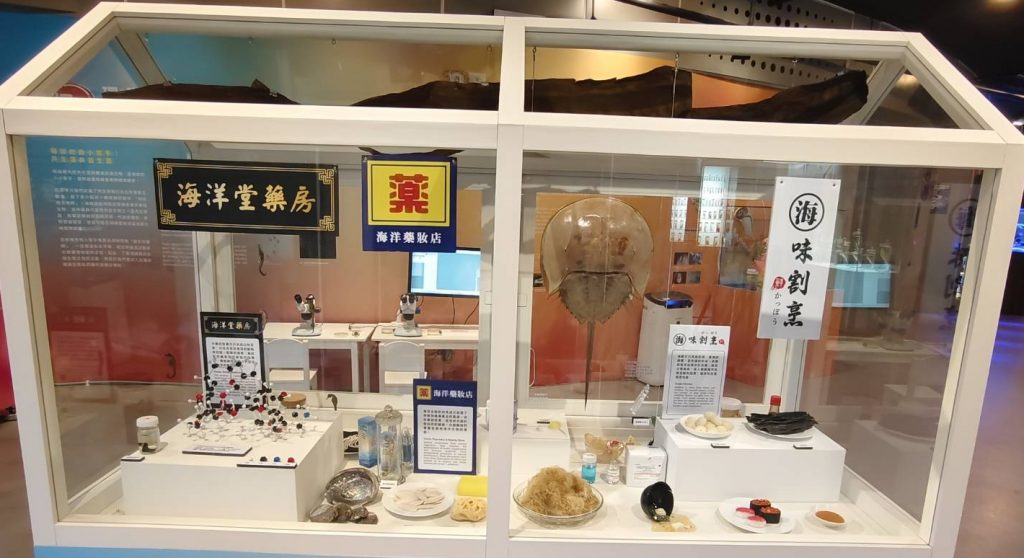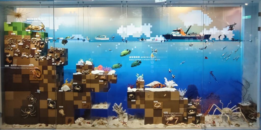 臺灣位於歐亞與太平洋板塊交界,地形多變、氣候多樣,孕育出豐富的生物多樣性。透過多件珍貴標本,呈現從海岸到海洋的生物多樣性面貌—現場展示了包括赤背松柏根、食蟹獴、黑背信天翁、白腹鰹鳥、高蹺鴴、鋸緣青蟳、鱗突擬扇蝦、椰子蟹、鸚鵡螺等出沒在海岸或海洋環境的生物真實標本或等大擬真模型,在這個展櫃,你能夠一覽國內海洋生物多樣性的真實樣貌。