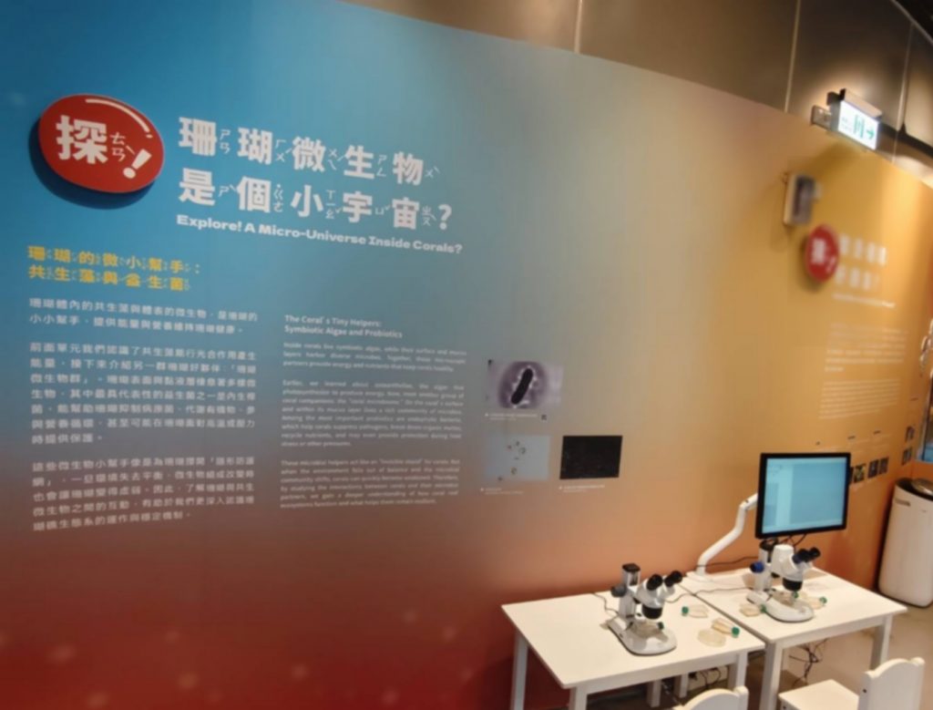 觀眾將從顯微鏡的視角進入珊瑚的體內世界。珊瑚體內的共生藻與體表的微生物群構成珊瑚健康的「隱形防護網」。其中,內生桿菌等益生菌能抑制病原菌、分解有機物、參與營養循環,甚至在珊瑚面臨高溫與壓力時提供保護。透過電子顯微鏡影像與互動螢幕,觀眾得以窺見這群微小卻關鍵的幫手,了解珊瑚與微生物間共生關係的奧祕,體會微觀尺度下的生態穩定機制。